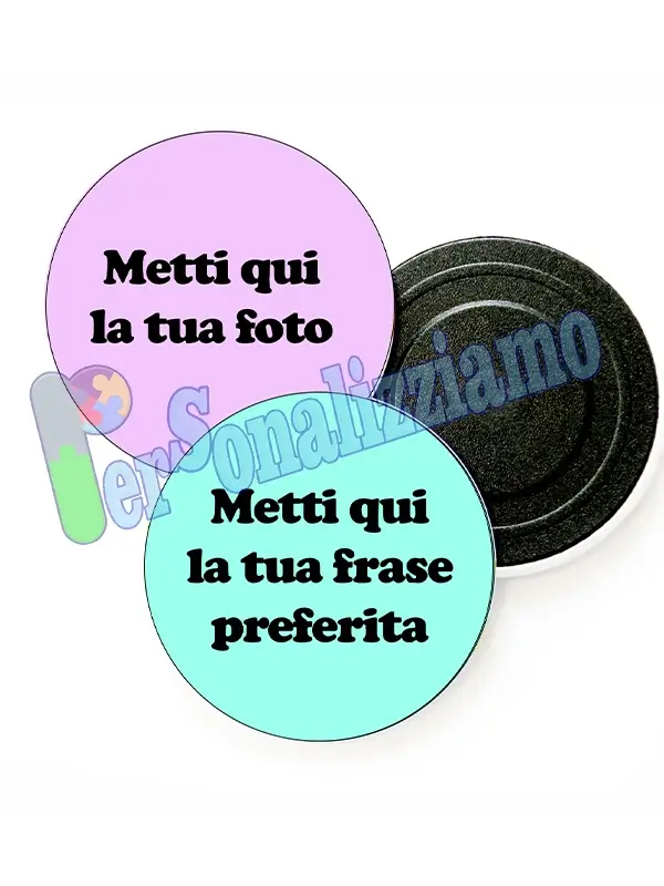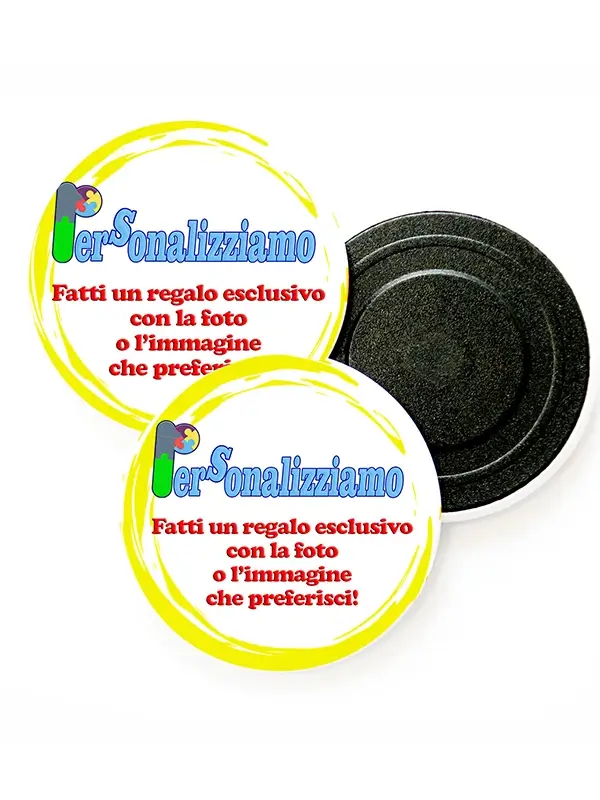 calamite personalizzate rotonde da 59mm sono interamente in metallo e ricoperte da una plastica trasparente che le protegge e dona una brillantezza notevole. La grafica viene stampata con macchinari professionali a 2400 dpi di risoluzione, la qualità è quindi garantita dalle più moderne tecnologie di stampa.